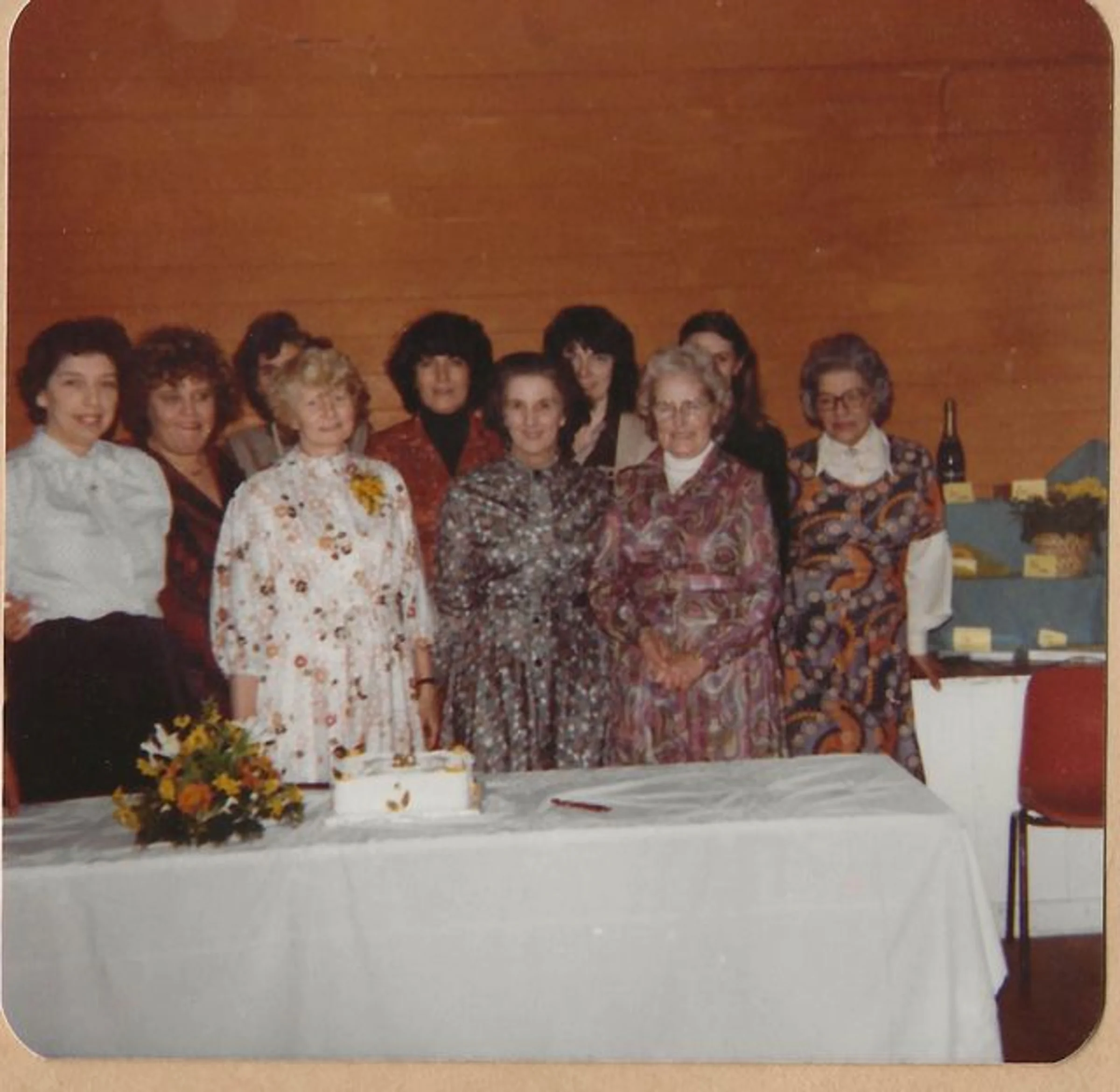 Undated colour photo of members at the Women Institute's Burns' Night party. Present are Muriel Mills and Christina Kirk.