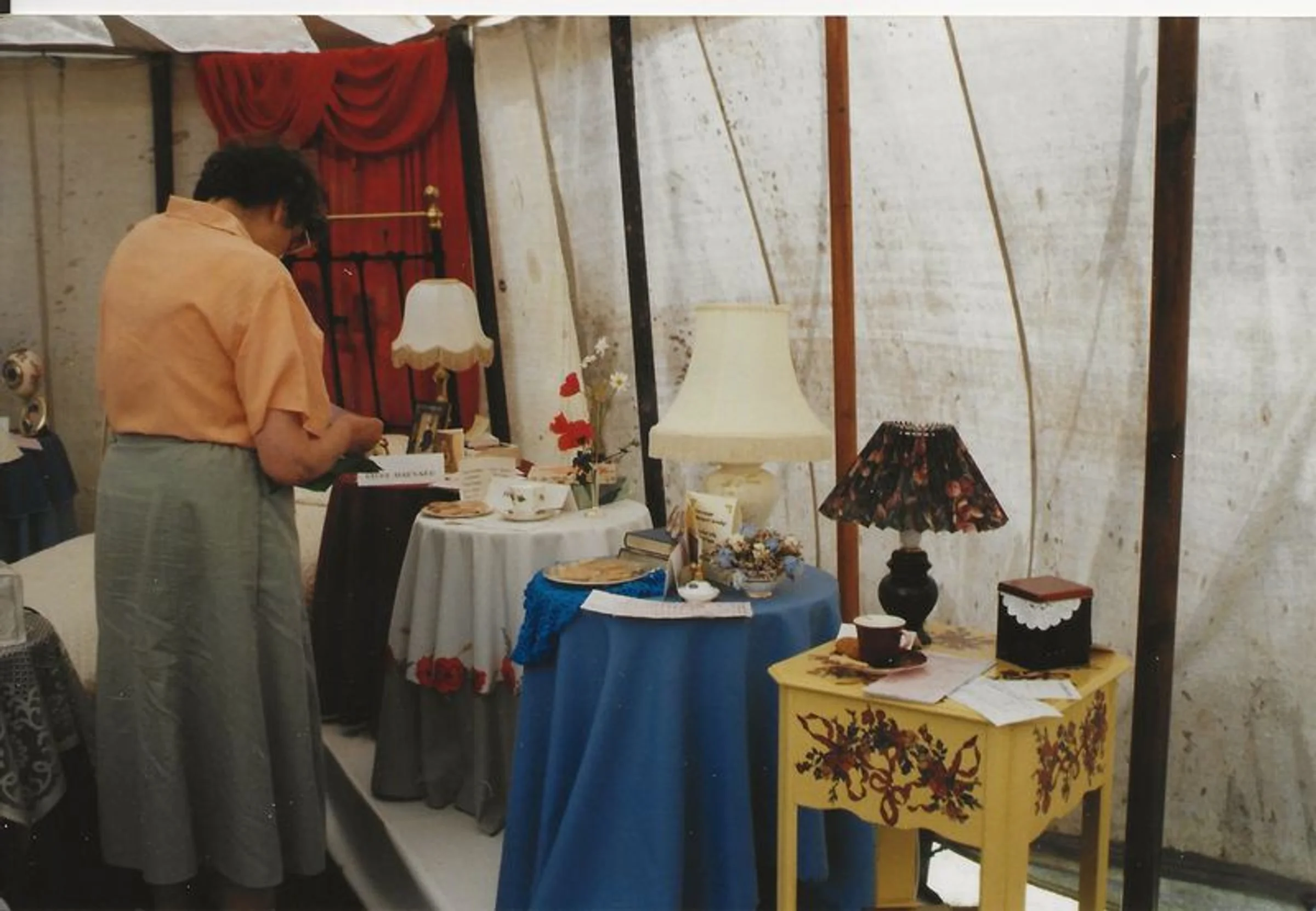 The entry by Marks Tey WI in the County Show in 1999. There are four small tables, some with a table light. They are inside a marquee. The Marks Tey entry is the table with poppies in a vase.