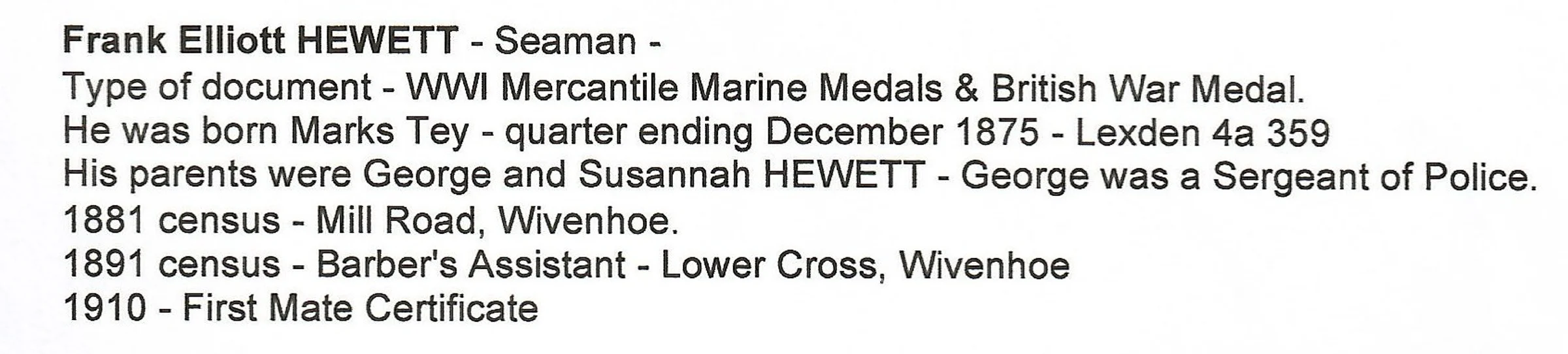 Information from the Public record Office on Frank Elliot Hewett, seaman.