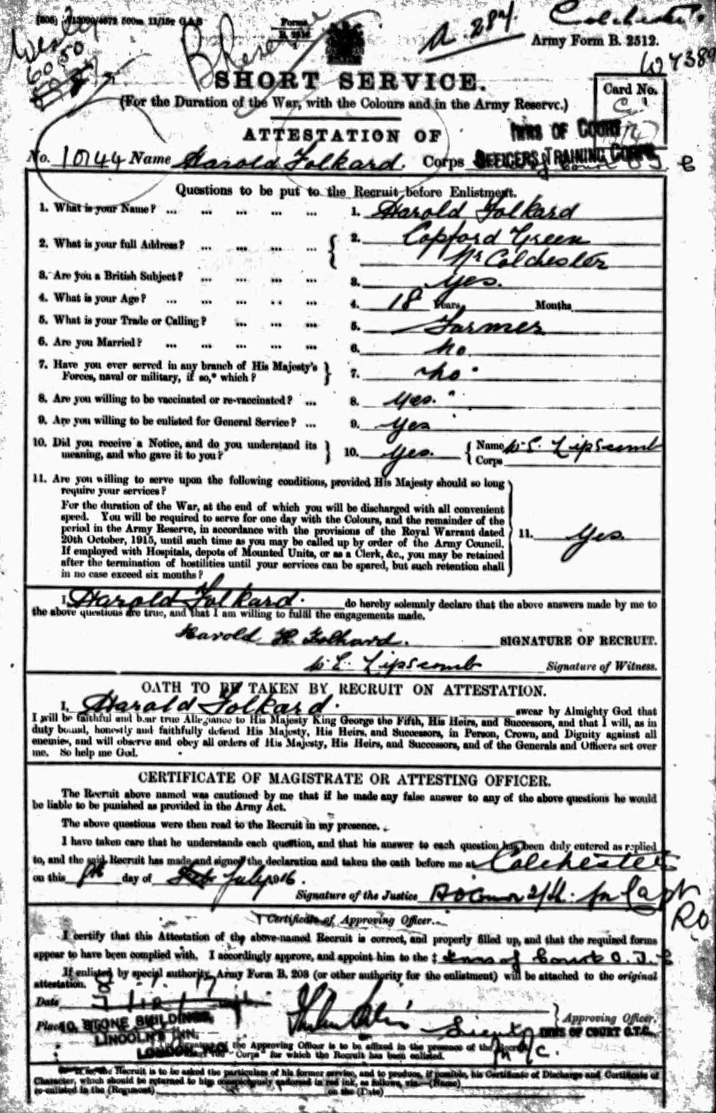WWI Harold Folkard enlistment