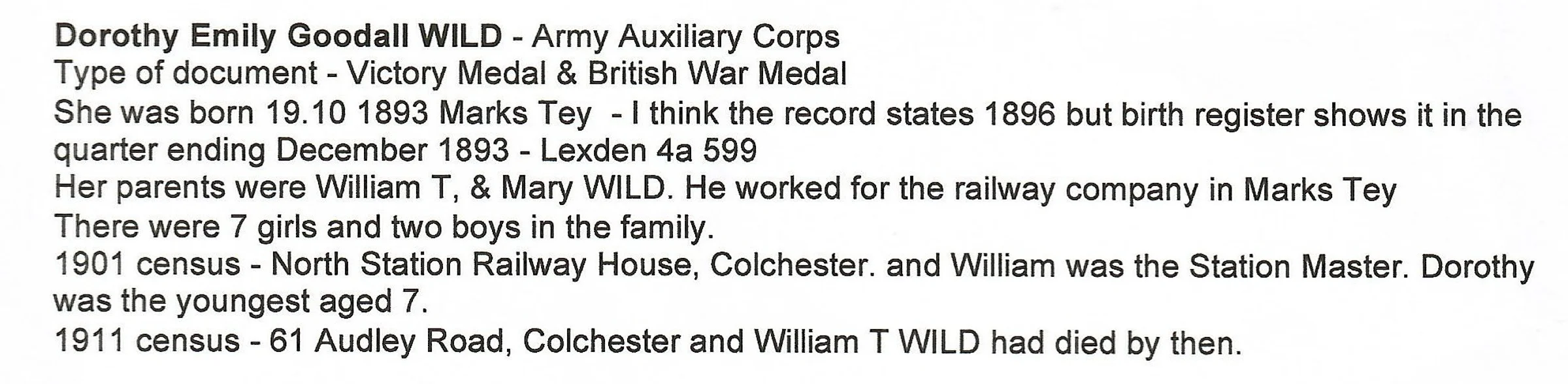 Information on Dorothy Emily Goodall Wild, Army Auxiliary Corps, from the Public Record Office.