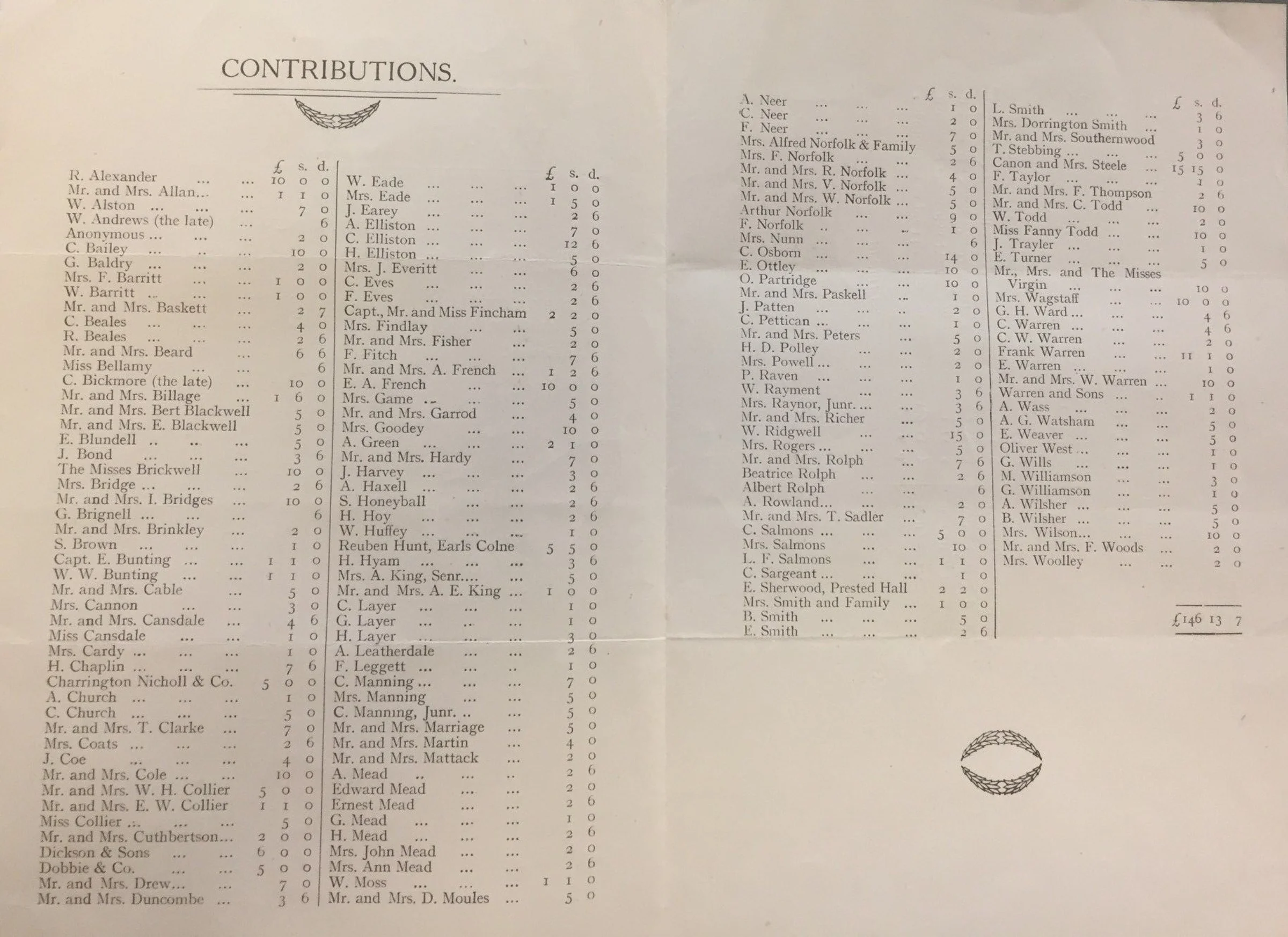 List of contributions towards the cost of the war memorial.
