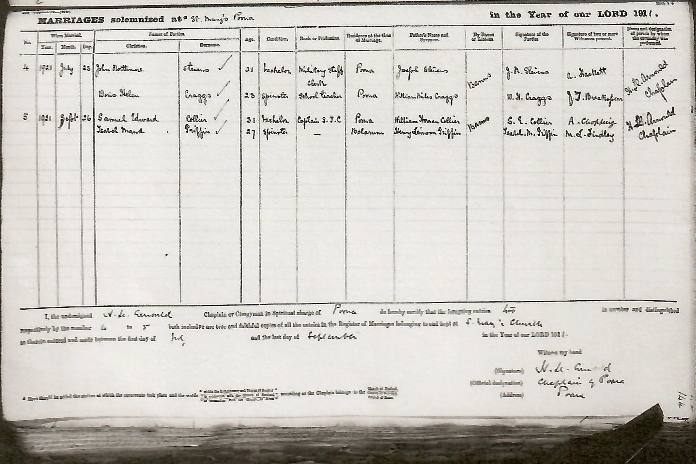 Entry in the marriage register of the marriage between Samuel Edward Collier and Isabel Maud Griffin.
