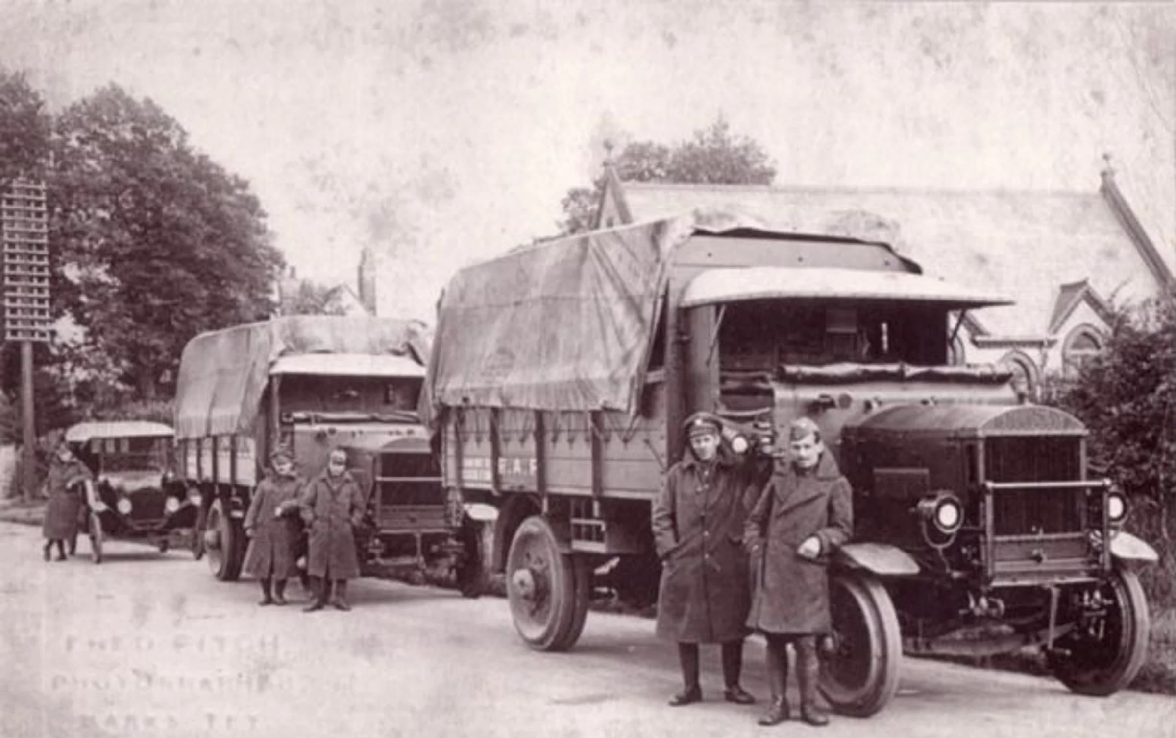 Photograph of trucks and soldiers along London Road, outside the Methodist church.