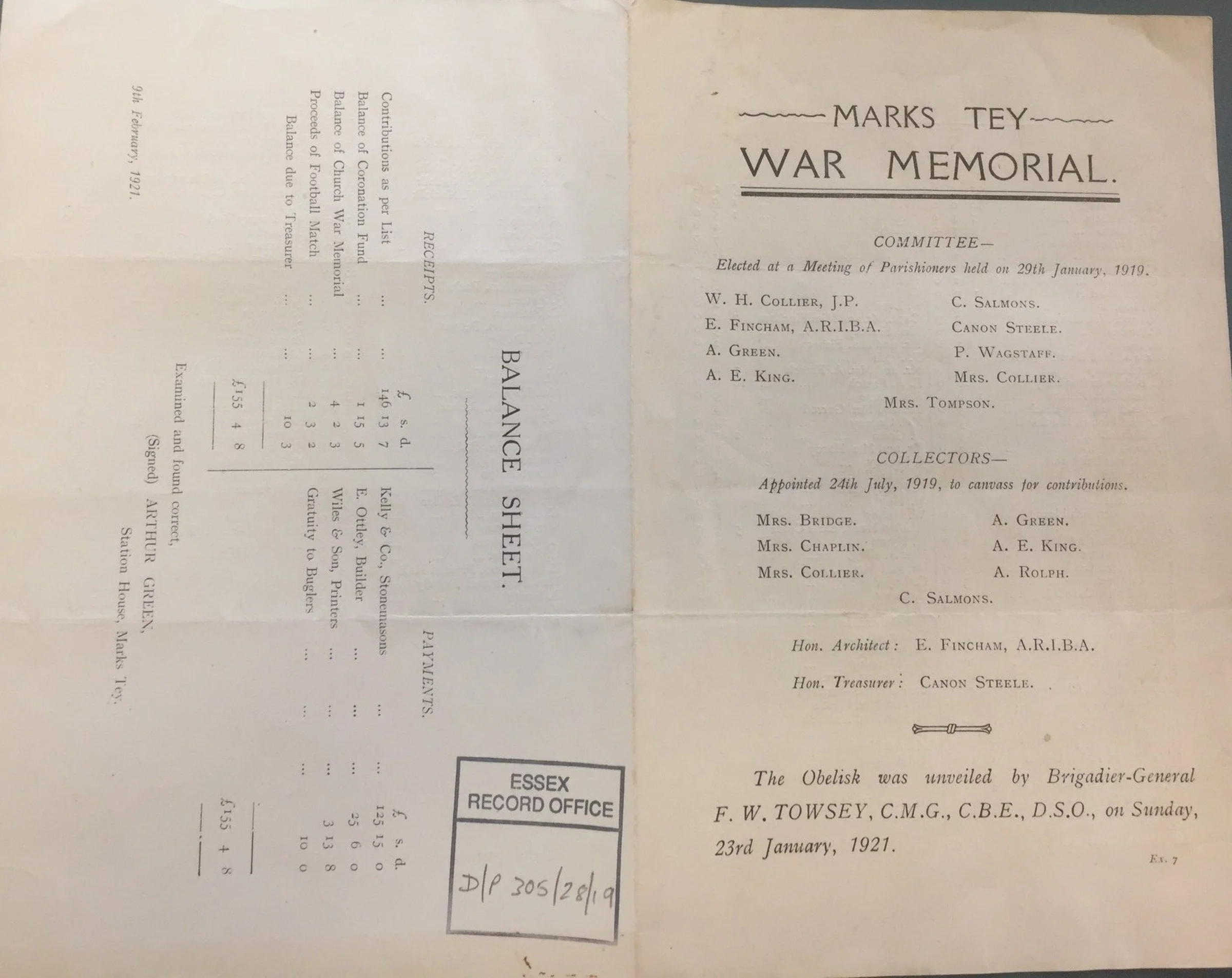 Document from the unveiling of the Marks Tey war memorial obelisk.