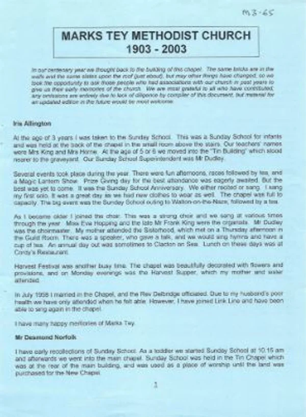Reminiscences of Marks Tey Methodist Church, 1903-2003