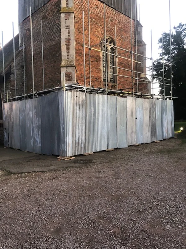 St Andrews Church Spire restoration, hoarding at the base of the tower