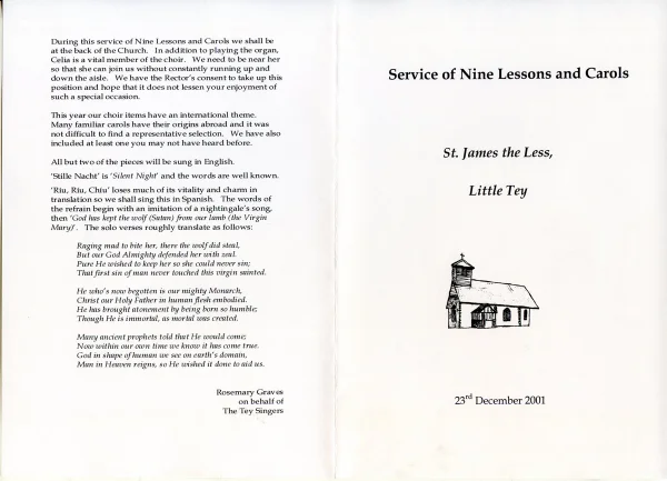 Christmas Carol Service Sheet for Little Tey church, 2001