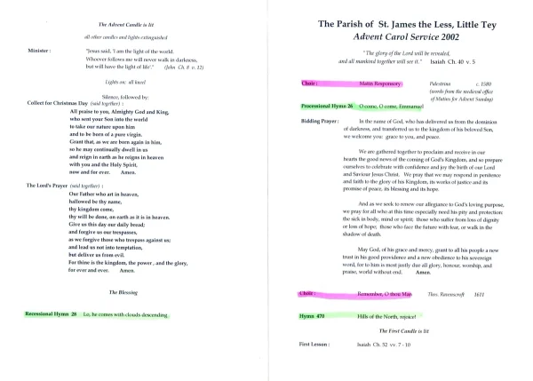 Christmas Carol Service Sheet for Little Tey church, 2002
