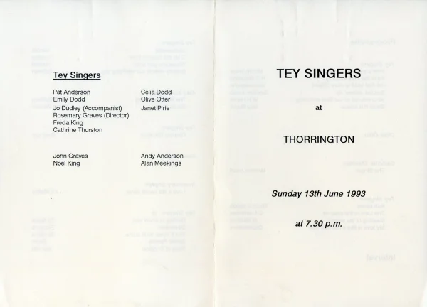 Programme for The Tey Singers Concert at Thorrington church in 1993