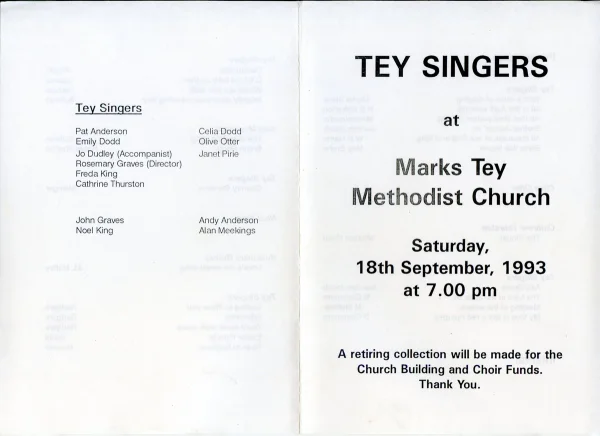 Programme for The Tey Singers concert at Marks Tey Methodist Church in 1993