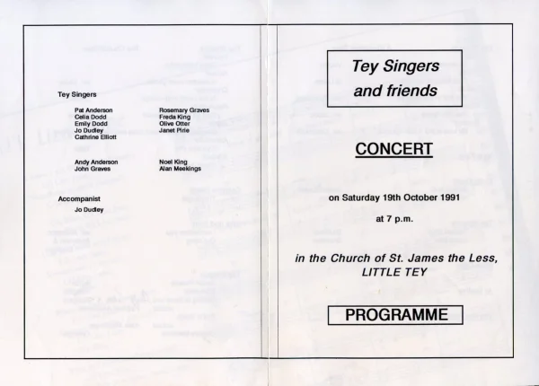 Programme for The Tey Singers Concert at Little Tey church in 1991