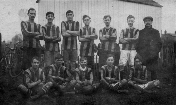 Marks Tey football team, vertical striped shirts, c1920