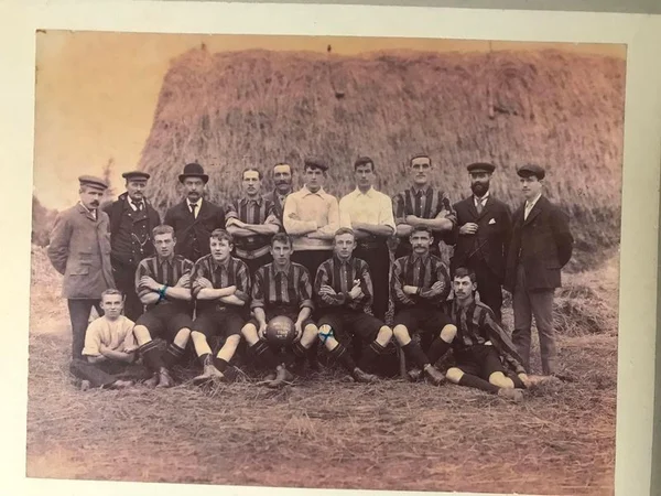 Marks Tey football team in front of haystack with labelling