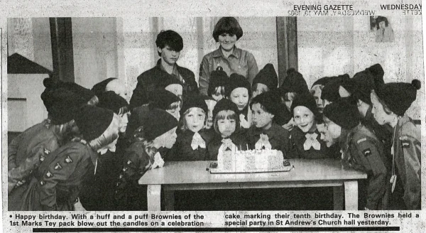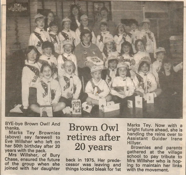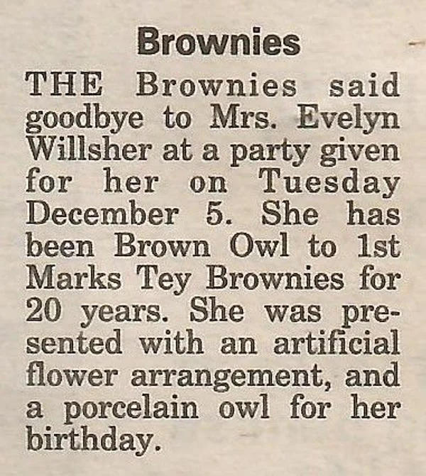 Shirley Clements retires from Marks Tey Brownies, 1984