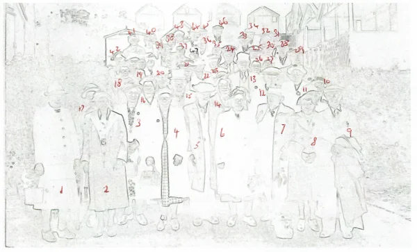 Darby and Joan Club outing, photo 1, numbers on drawing of photo