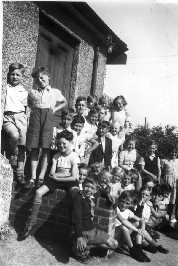 School children outside the old Church Hall, c1954, labelled