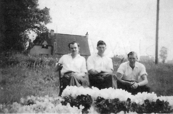 Hunt brothers selling sweet peas outside Hall Cottage c1946