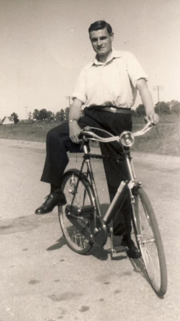 Dennis Todd getting on or off a bicycle