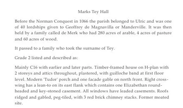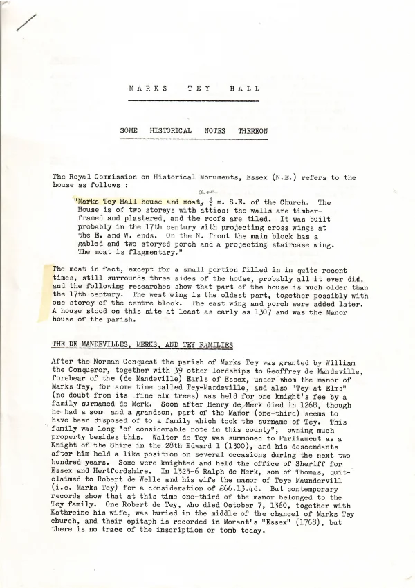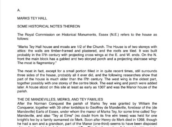 Marks Tey Hall, some historical historical notes thereon, transcript