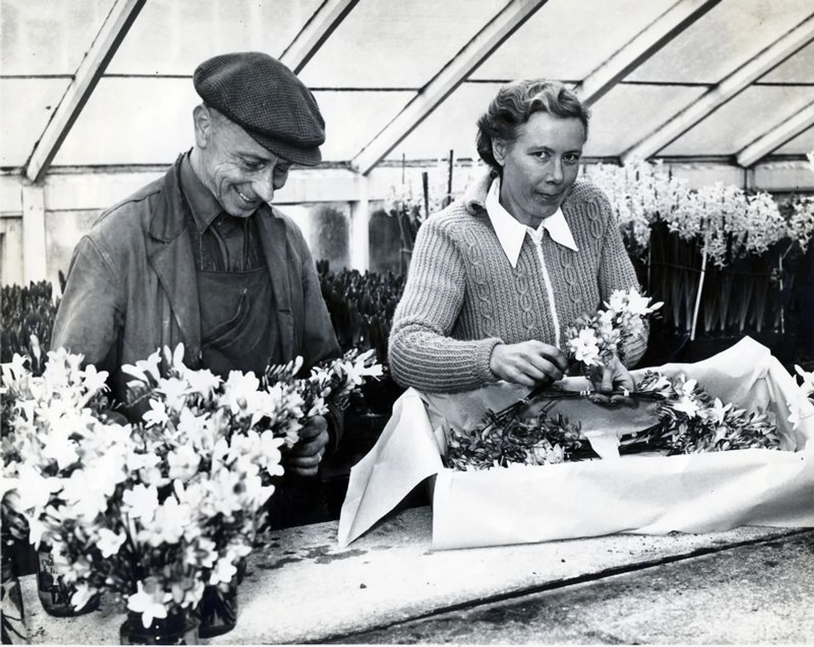 Another local nursery, Tey Gardens at Little Tey, specialised in producing arum lilies, chrysanthemums under glass, and gladioli, with the rest of the site used for cereal production. The man on the left here is Alec Mattin.