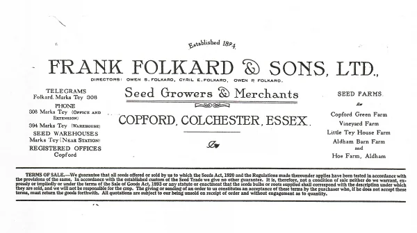 In Copford, Frank Folkard followed in his father William’s footsteps by becoming a farmer, not of livestock but of seeds. He started the seed business from Copford Green, supplying grass mixtures, and a range of roots including mangolds (sometimes known as mangelwurzul), kohl rabi and kale. When the business needed more warehouse space, it took over a disused maltings building in Station Road, Marks Tey, along with two cottages and the use of a nearby railway siding. In the late 1960s the seed warehouse was demolished as part of the A12 road scheme and the business closed.
