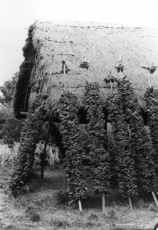 The heads, when ripe, are gathered by men wearing gloves and aprons of leather to protect them from the spines of the plant, and are tied by the stalks onto long poles. Each pole when laden is called a ‘pack’, and the average yield is said to be ten packs per acre. The packs are placed in sheds until the heads on them are thoroughly dry, when they are sold to buyers at Leeds, whither they are dispatched by rail