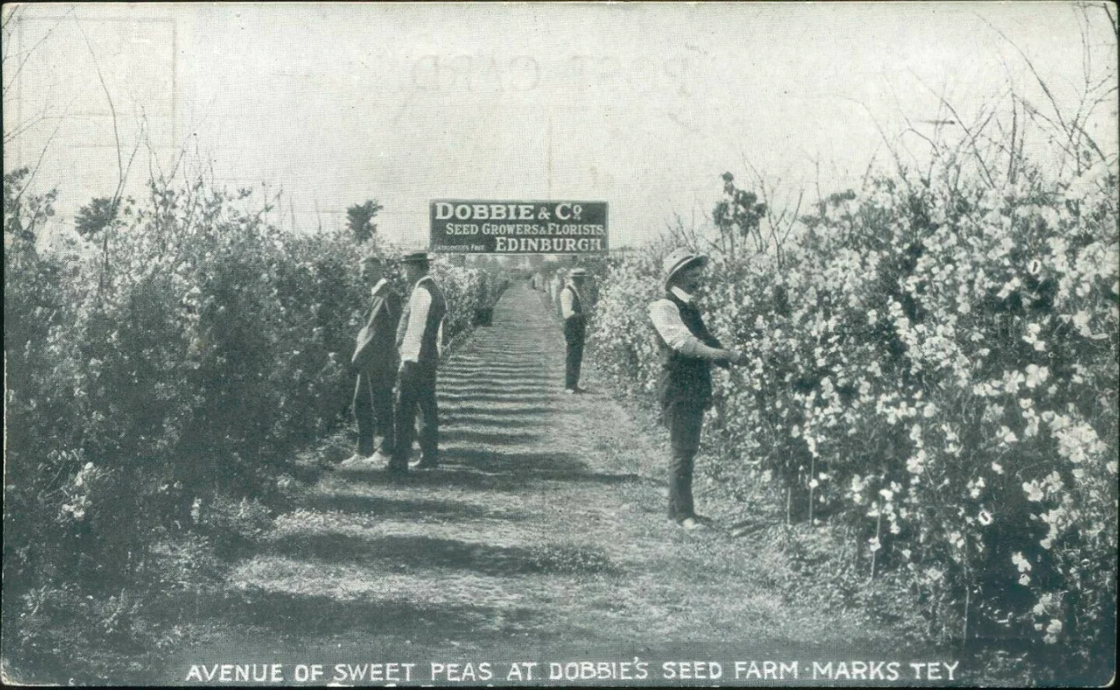 Dobbie and Co were a Scottish firm who moved to Marks Tey in 1905, taking on Palmers Farm. They grew both edible crops and flowers but specialised in sweet peas. There had been increasing popular interest in growing sweet peas from the late 19th as the scented flower became a must have in people’s flower gardens and the Essex soil and climate was perfect for them. Dobbie’s owner, William Cuthbertson was a respected expert in growing sweet peas who published books and pamphlets on the subject. As Marks Tey residents, William and his valued associate Andrew Ireland joined the Parish Council, and even gave a new sweet pea the name ‘Mrs Collier’ after the wife of the council chairman at the time.