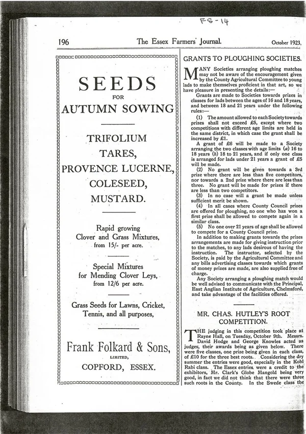 A 1933 advert shows the range of seeds on offer from Frank Folkard and Sons. Crops like clover, lucerne (also known as alfalfa) could be grown as soil improvers. From The Essex Farmers’ Journal, October 1923